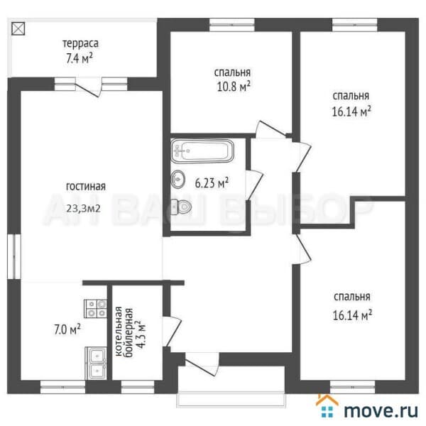 В доме кухня-гостиная - 30 м2, три спальни - 16,4 м2, - 16,4 м2, - 10,8 м2, ( в двух спальнях есть ниши под гардеробную ), санузел совмещён - 6,2 м2, котельная-бойлерная - 4,3 м2, терраса - 7,4 м, год постройки дома 2024 г.