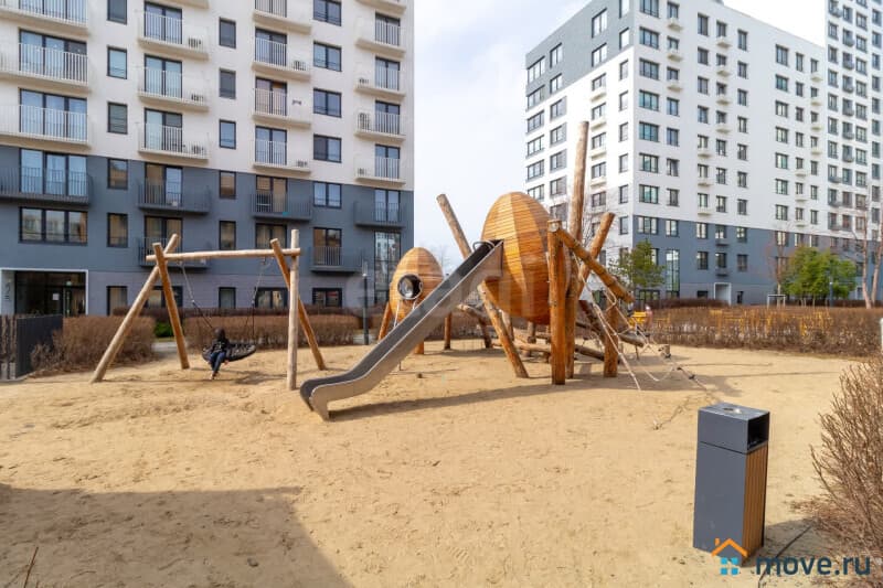 Двор очень красивый и функциональный. Много зелёных насаждений, кресел, лежаков, лавочек, детская площадка и зона ворк аут. Высажены деревья, на которых висят красивые деревянные скворечники.